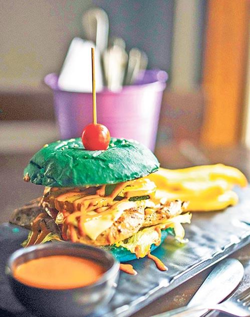 Kaitlyn's Beer Garden offers pick-me-ups with vibrant Rainbow Bread Sandwiches and Blue Bun Burgers. Enjoy burgers like The Bandra 50 (Veggie Patty, Spicy Homemade Sauce) and The Hangover Chicken Burger (Chicken, Cheddar, Ranchito Sauce) encased in blue-coloured buns. Also savour sandwiches like Monte Cristo (Ham and Cheese), Herbivore (Goat's Cheese, Grilled Veggies, Chipotle Mayo), Kaitlyn's Club House (Classic Chicken Club Sandwich) and The Smoked Bbq Chicken Sandwiches that are made with slices of multicoloured, rainbow bread.