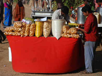 The one thing common to all of these is crowds. At Badshah, bara hundi and Bade Miyan there's always a wait before you're seated - and bhelpuri, wherever there are crowds you'll find a bhelpuri vendor. All, in their own way, are the common man's food. Bara hundi which literally refers to 12 containers filled with different heavy gravies made from lesser cuts of meat like tail and trotters are the working man's meal. Bhel puri the much loved, delightful snack of puffed rice tossed with different chutneys is one of the cheapest and easily snacks after the vada pav. Not everyone comes to Crawford Market for Badshah's delicious multi-layered, multi-hued Royal Falooda but almost everyone who shops at Crawford market will stop by to pay their respects. Bade Miyan is probably one of the few places that people from all over the city will actually drive to for a baida roti or a mutton roll. Any evening in the week the little lane behind the Taj is swamped with vehicles and pedestrians congregated around the sigdi waiting for their ordered to be delivered by an army of servers.