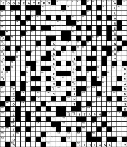 DOWN: 2 Squalid, 3 Neat, 4 Acids, 5 Nom, 6 Ism, 7 TNT, 8 Reel, 9 Aesop, 11 Trattoria, 12 Yo-heave-ho, 13 Uni, 14 Pass sentence, 15 Groaning, 17 Bad egg, 20 Imp, 21 Slav, 22 Measuring, 23 Yew, 25 Apse, 26 Mar, 29 Norsk, 31 Voles, 34 Rheum, 35 Tuvalu, 36 Peewit, 40 Sale, 43 Elands, 44 Tax it, 47 Apartheid, 49 Subdues, 51 Shangri-la, 53 Chinese junk, 54 Deem, 55 Rue, 56 Dor, 58 Foeman, 60 Fraser, 61 Ayr, 63 Insomnia, 65 Roar, 66 Finger-print, 68 Recap, 71 Beddy-bye, 73 User, 77 Obligated, 80 Rule, 81 Germinate, 83 Timor, 85 Grilse, 87 Figaro, 91 Kids, 93 Malachi, 97 Dud, 98 Helping hands, 100 Aeon, 102 Pinion, 105 Ent, 106 ATM, 107 Umber, 109 Subnormal, 111 Mental, 112 Insane, 114 Idolising, 115 Structure, 117 Igor, 119 Ionia, 120 Unseemly, 122 Wilma, 124 Riyal, 128 Snooty, 130 Sailing, 132 Derv, 134 Sets, 136 O'er, 137 Brook, 139 Go dry, 140 Tea, 143 Noa, 145 Sure, 147 Skid, 150 Sea, 152 Tae, 153 OAS, 154 Eel.
