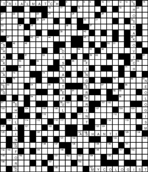 Down: 2 Gestapo, 3 Earp, 4 Rhett, 5 Son, 6 USA, 7 DII, 8 Erne, 9 Raged, 11 Take issue, 12 Intuition, 13 Let, 14 All and sundry, 15 Lysander, 17 Grouch, 20 Lev, 21 Tiro, 22 Honoraria, 23 She, 25 Grey, 26 Sic, 29 Istle, 31 Relet, 34 Grope, 35 Tomato, 36 Bright, 40 Tosh, 43 Aromas, 44 Allyl, 47 Racialist, 49 Petting, 51 Faintness, 53 Consciously, 54 Cues, 55 IOU, 56 Mug, 58 Miasma, 60 Alumni, 61 Ope, 63 Parodied, 65 Raki, 66 Finger-print, 68 Icier, 71 Sargasso, 73 Ager, 77 Off season, 80 Nina, 81 Roman nose, 83 Hamal, 85 Nuance, 87 Cantab, 91 Herm, 93 Correct, 97 CIA, 98 Recollection, 100 USSR, 102 Slipup, 105 Aye, 106 Lsd, 107 Stoat, 109 Maidenish, 111 Gideon, 112 Tithes, 114 Ptarmigan, 115 Storm cone, 117 Oast, 119 Nelis, 120 Pellagra, 122 Prill, 124 Basic, 128 Putrid, 130 No doubt, 132 Yeti, 134 Rets, 136 Ier, 137 Eland, 139 Angst, 140 Lob, 143 Noh, 145 Sway, 147 UCLA, 150 NDA, 152 Ape, 153 Tis, 154 Nae.